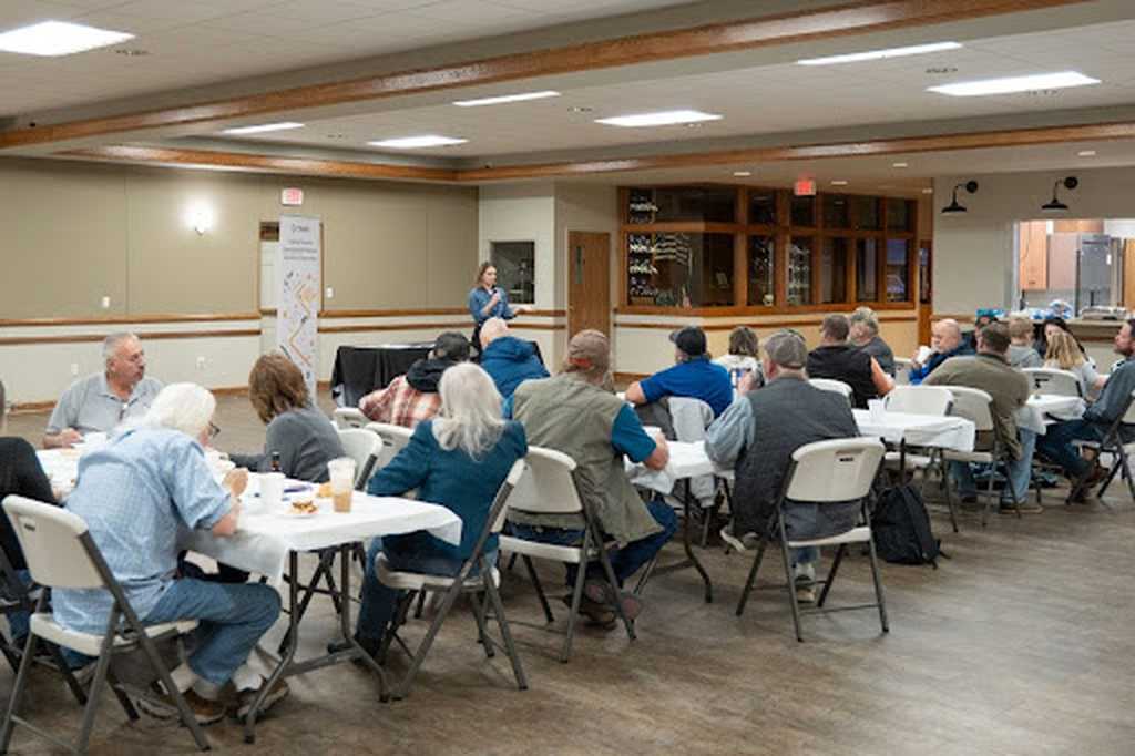 Before a new operations site is established, Charm conducts stakeholder outreach with neighbors and community members to thoroughly explain Charm’s mission and business, answer questions, and get input from the community. Above: Charm’s Senior Stakeholder Manager Alison Kelman speaks to a room full of interested community members in Western Kansas.